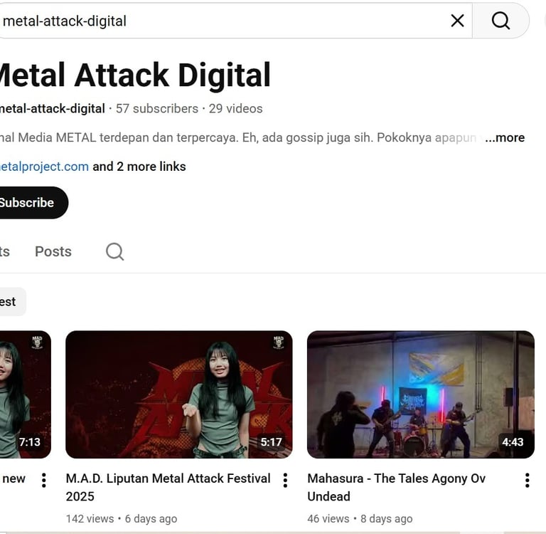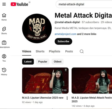Metal Attack Digital (M.A.D.) merupakan saluran resmi dari AMetalProject yang dirancang untuk menjadi pusat informasi dan hiburan bagi para penggemar musik metal di Indonesia dan mancanegara. Dengan perspektif yang fresh dan beragam, M.A.D. berkomitmen untuk mengintegrasikan konten yang berkaitan dengan dunia metal dalam satu platform yang mudah diakses.